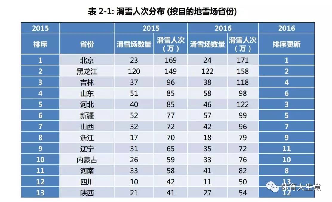 ▼2016中国滑雪人次TOP 13省份(含自治区、直辖市)