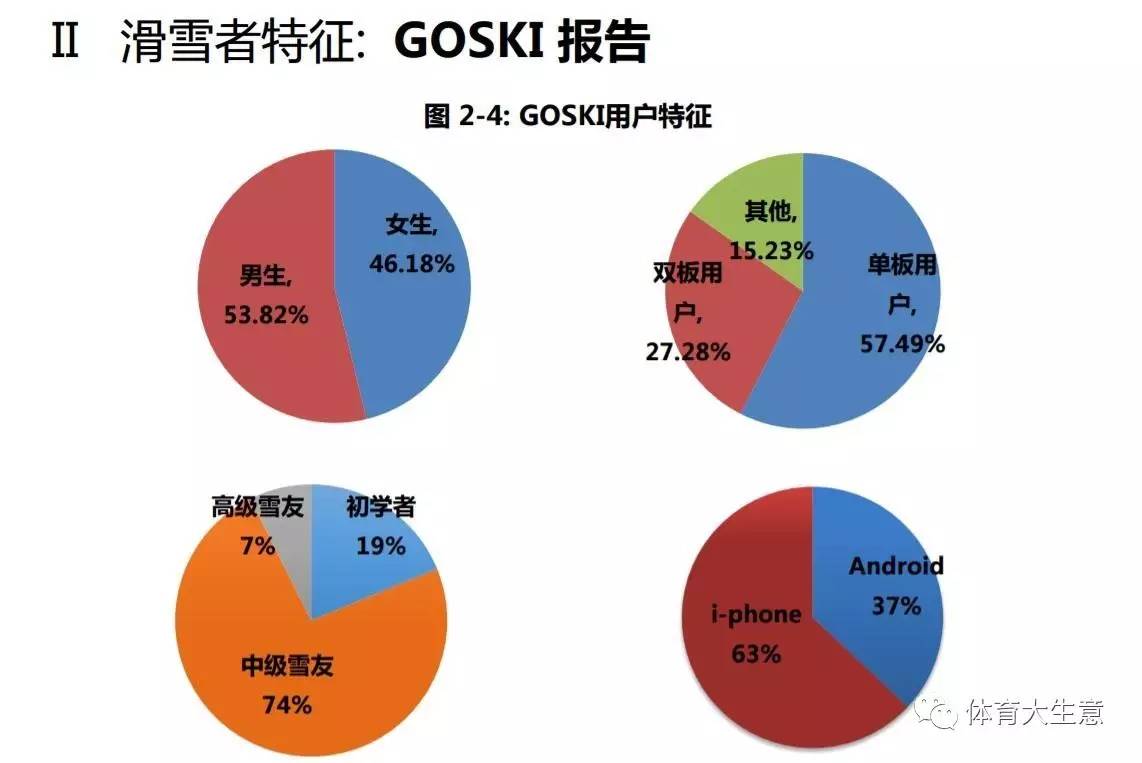 《2016中国滑雪产业白皮书》同时联合了多个滑雪相关互联网产品,对国内滑雪族作了大概的描述。根据GOSKI的数据,男性雪友和女性雪友比例差异不大,男性以53.82%稍稍领先。另外GOSKI的用户更热衷于单板,单板爱好者比例达到57.49%,而双板爱好者只有27.28%。