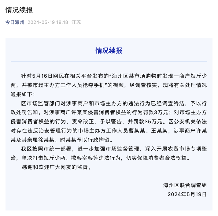 据“今日海州”微信公众号消息,针对5月16日网民在相关平台发布的“海州区某市场购物时发现一商户短斤少两,并被市场主办方工作人员抢夺手机”的视频,经调查核实,现将有关处理情况通报如下:区市场监管部门对涉事商户和市场主办方的违法行为已经调查终结,予以行政处罚告知。对涉事商户许某某侵害消费者权益的行为罚款3万元;对市场主办方侵害消费者权益的行为,责令改正,予以警告,并罚款35万元。区公安机关依法对存在违反治安管理行为的市场主办方工作人员曹某某、王某某,涉事商户许某某及其亲属徐某某、时某某予以行政拘留。