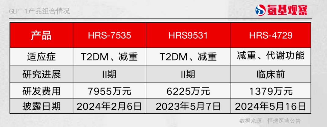 Hercules看中的三款产品,分别是口服小分子GLP-1受体激动剂HRS-7535,GLP-1/GIP双受体激动剂多肽注射和口服产品HRS9531以及下一代肠促胰岛素产品HRS-4729。其中,HRS-7535、HRS9531处于临床II期,HRS-4729则处于临床前研究。