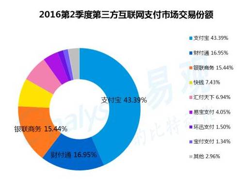 易观数据显示,目前互联网支付市场的形势可以概括为:老二财付通后起之秀,在多方面进攻霸主支付宝;老大支付宝拥有庞大存量市场,但正从寡头沦为巨头;老三银联被微信支付宝拉下霸主地位后动作频频,其颓势却难以挽回。前三之外,还有块钱、汇付天下、易宝支付等虎视眈眈,努力维持自己份额的同时,也希望从支付宝、微信口中谋食。该领域内,目前京东市场份额还属于“忽略不计”的范畴。