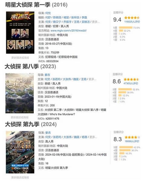 但如今的剧本杀行业热度已有回落趋势。据线下剧本平台小黑探数据,2024年4月线下剧本杀游戏收入为1.8亿元,而2023年4月的数据为2.9亿元,2022年4月为5051万元。带火这一游戏形式的综艺真人秀《明星大侦探》豆瓣评分从第一季的9.4分降至第八季的8.6分,评价人数从11.6万减至4.7万,近日结束的第九季仅有1.8万人给出了8.3分。