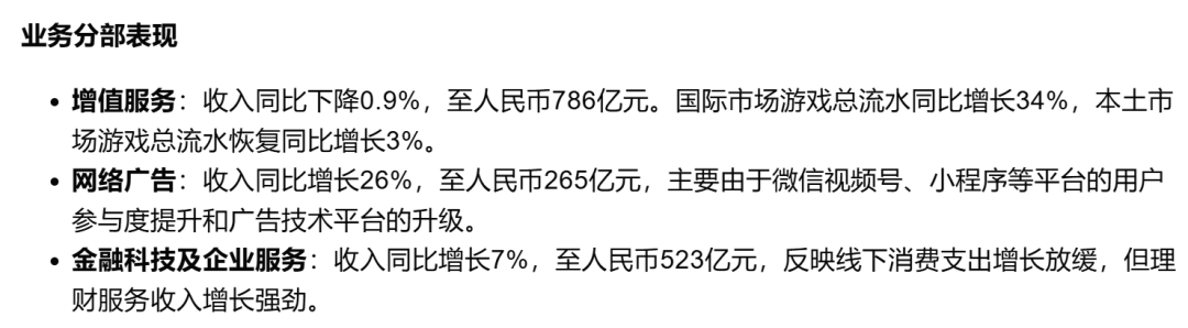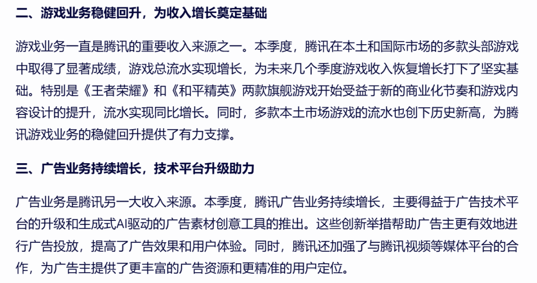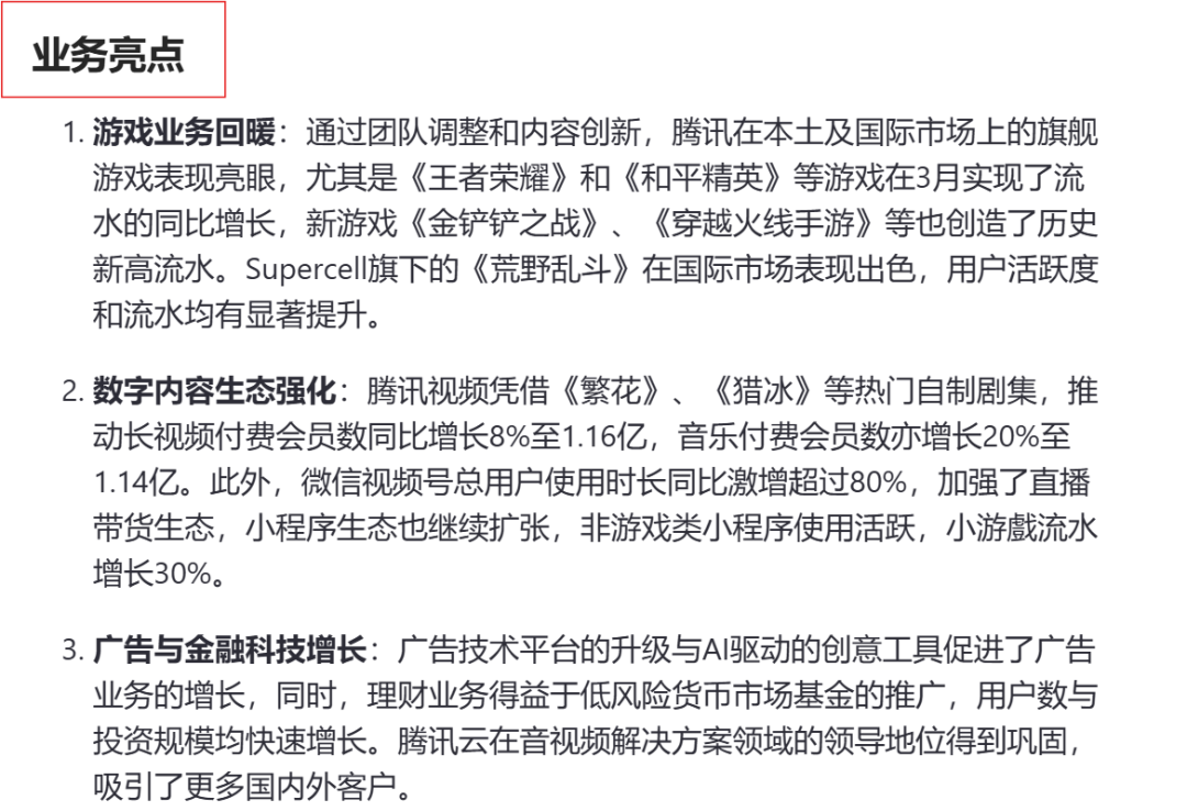 于是,我又尝试上传了阿里、腾讯两家在港股上市的最新财报,结果发现,随着可参考“知识库”中信息维度的丰富(三大财务报表之外,还涵盖了详细的业务构成,以及分部业务、财务表现等),几个大模型产品,也顺势在分析维度上进行了拓展,除了拎出关键财务指标,还更多在企业的“业务亮点”以及业务与财务之间的关系上进行了着重分析和展现。而这对于我来说,的确可以形成一些借鉴和参考。