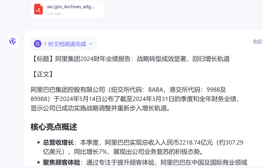 当然,除了A股和港股财报,我常常也需要读一些在美股等国外股市上市的公司的财报。我试图重开一个对话框,上传阿里在美股市场发布的英文版财报,几个大模型无一例外,都准确读出了里面的关键信息。事实证明,AI在读英文文档这件事上,比我做得更快更好一些。