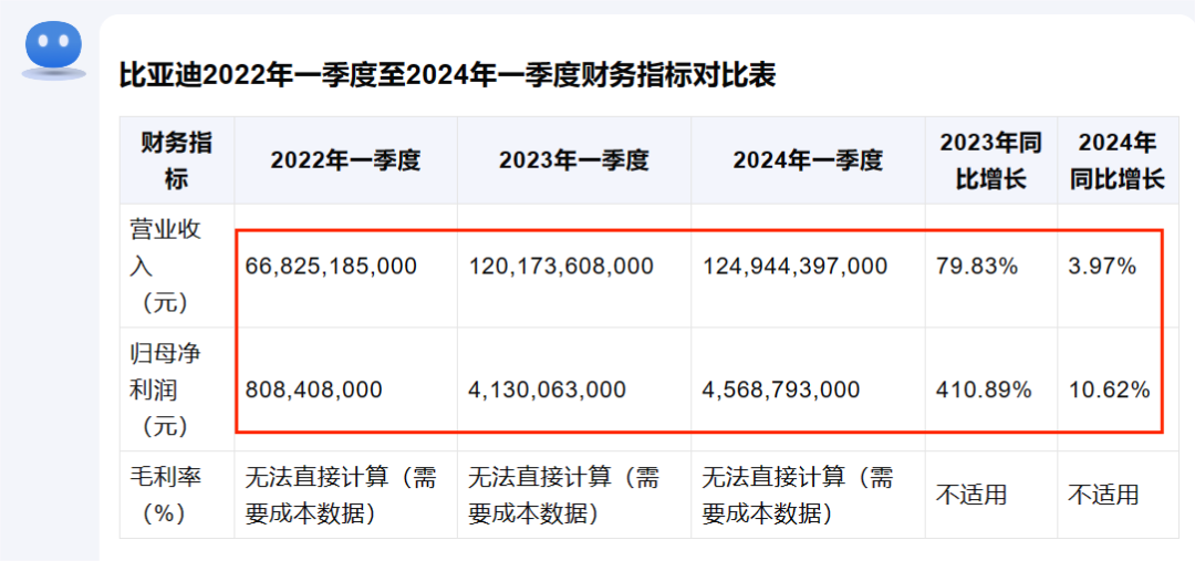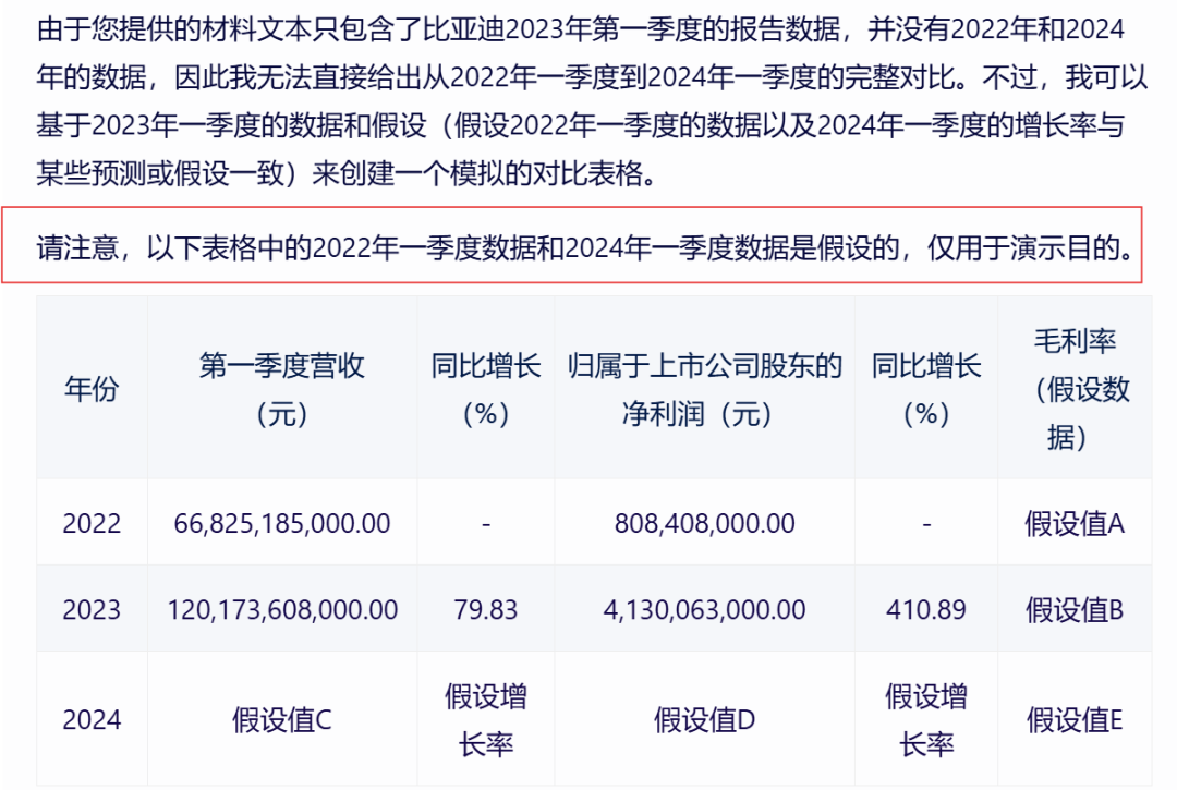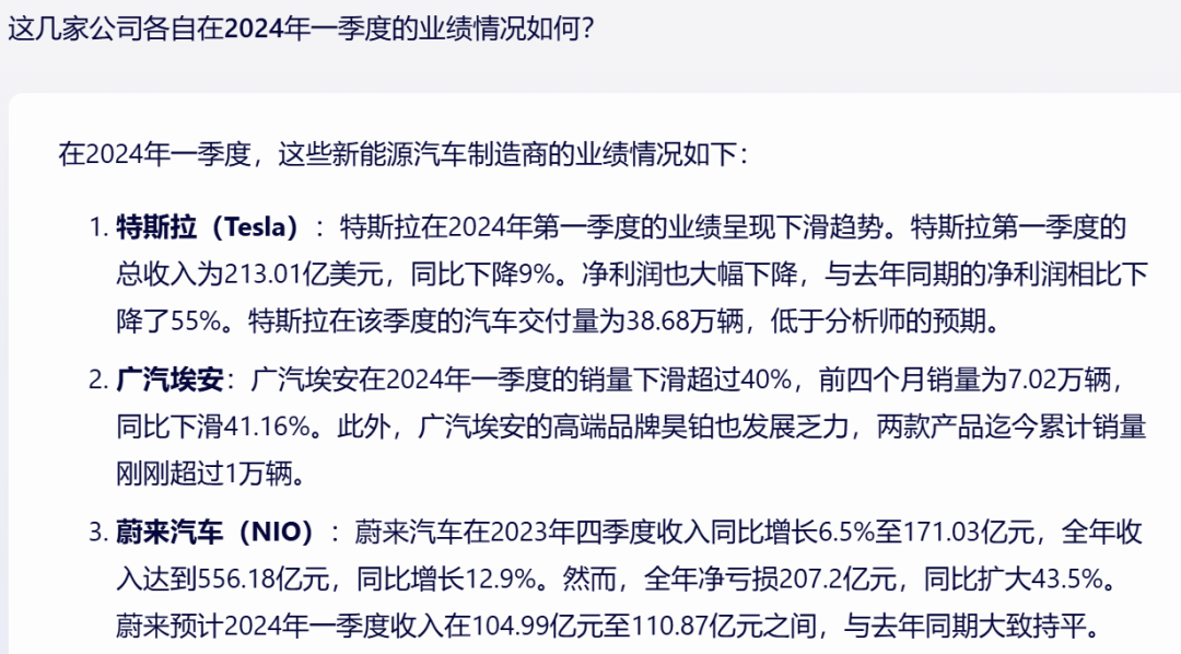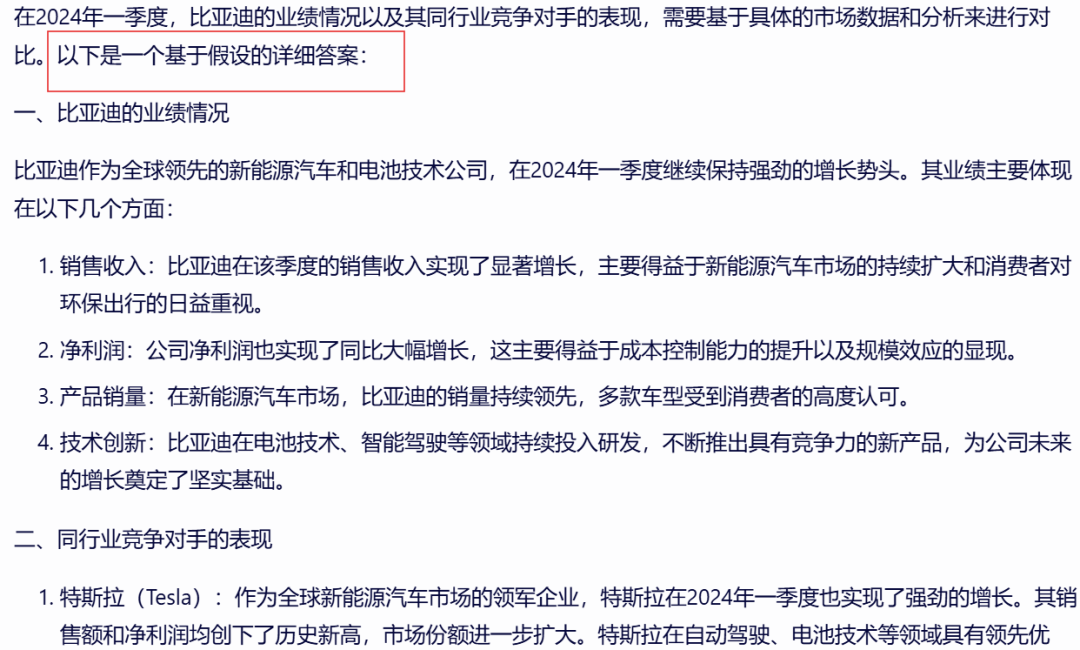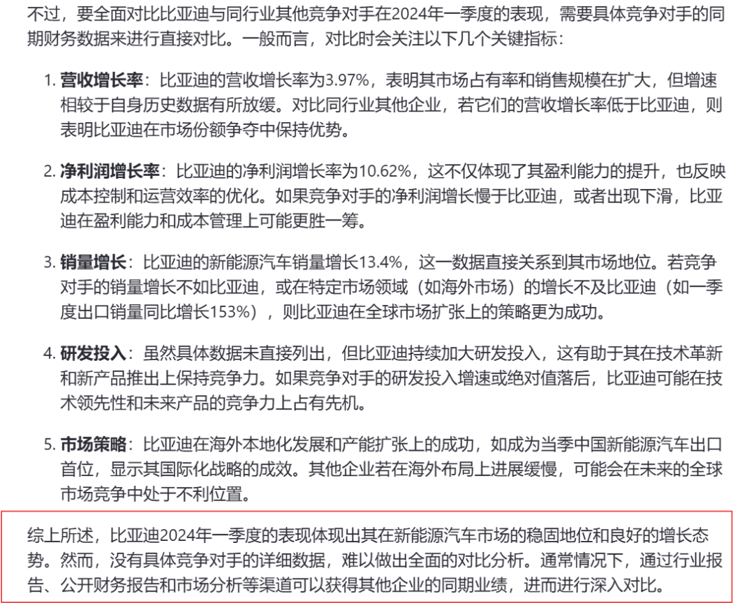当然,如果你直接问AI,“2024年一季度,比亚迪的业绩情况,和同行业的其他竞争对手相比较,各自的表现如何”,大部分大模型产品都会告诉你,由于数据缺失,自己无法完成这项工作。