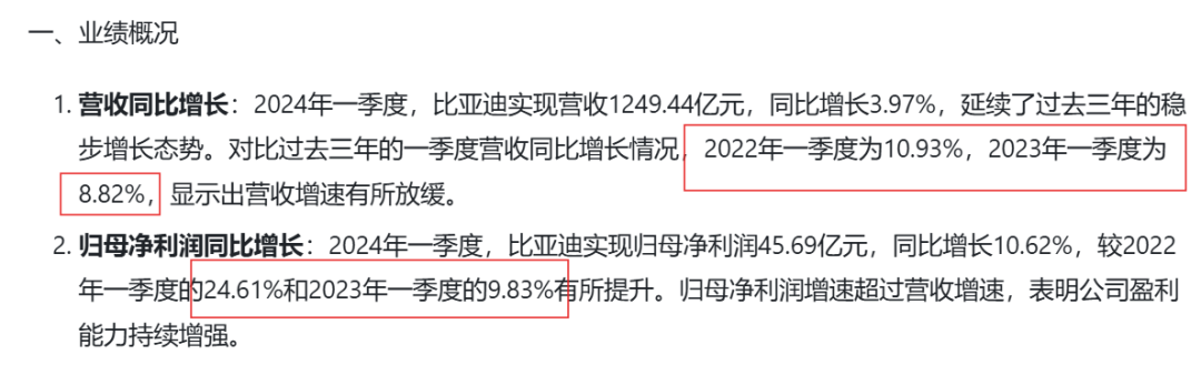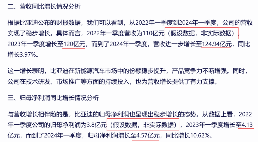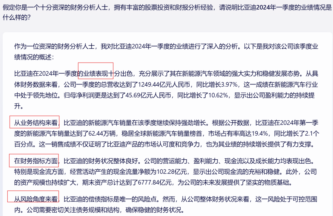 模拟这个场景,我决定,先用最“傻瓜式”的问法,直接将比亚迪“最新发布”的2024年一季报,丢给大模型,让AI参考文件中的各项信息,帮我写一篇财报分析稿,看AI是否已经能在读财报这件事上达到“一键即出”的水平。