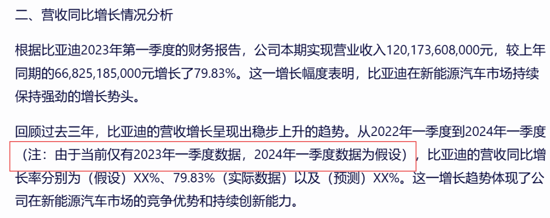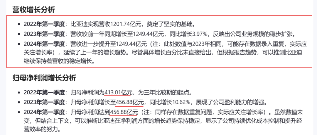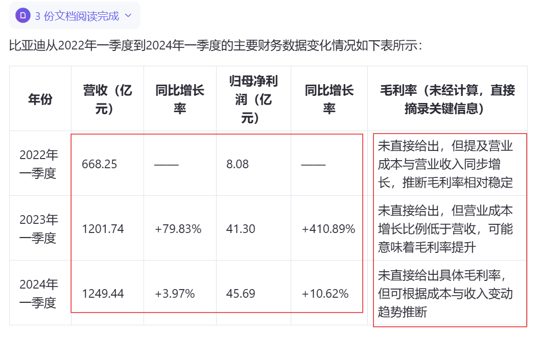 为了纠正这些“幻觉”和错误,获得更准确的结果,我试图将比亚迪2022年一季报和2023年一季报也传给大模型,让它结合补充文件,进一步回答过去三年的变化趋势。