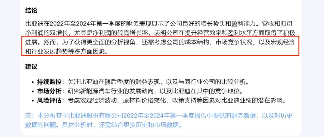 值得一提的是,kimi给出的回答中,除了详细列出了营收和归母净利润在过去三年的变化,并加以分析,还进一步给出了结论和建议,并指出如果要获得更全面的分析视角,还需考虑公司的成本结构、市场竞争状况、以及宏观经济和行业发展趋势等多方面因素。