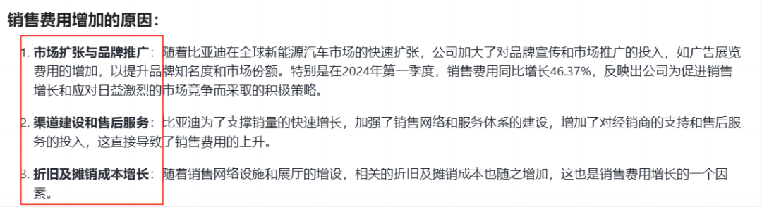 我根据这一提示继续追问了kimi关于比亚迪过去三年成本结构的变化、研发费用和销售费用增长的原因等问题,其都能比较准确地找出对应数据,并给出一定的分析。