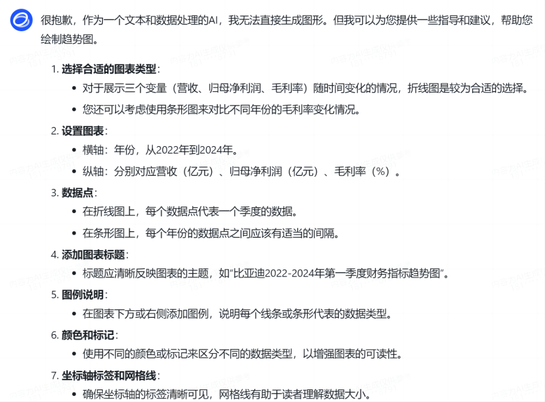 面对进一步根据表格制作一个趋势图的要求,几个大模型均表示自己无法直接生成图形,但是可以提供一些指导和建议,帮助用户使用Excel或其他图表工具自行作图。