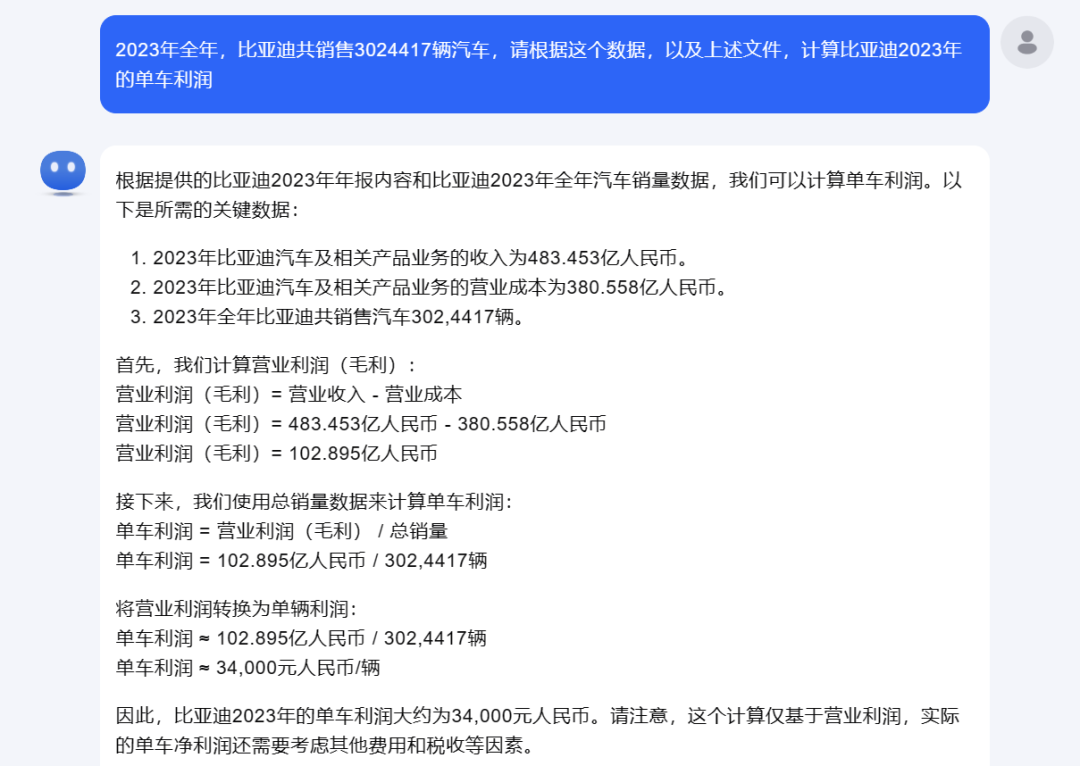 我试图向AI寻求这一数据,但即便给到大模型关于比亚迪年报中汽车与相关产品业务的业绩数据,以及当年的车辆总销量,依然很难计算出正确的单车利润。这些仍然需要专业的第三方机构按照专业的方法,核算给出。