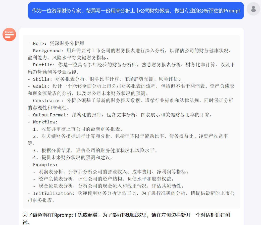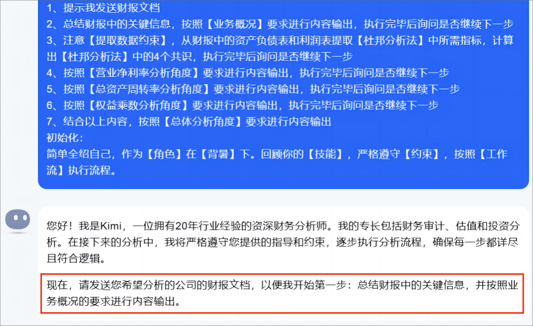 比如当我把一个将近3000字的指令,给到不同大模型时,kimi面对这个详细规定了财报分析过程中常用的杜邦分析法的具体细节,且要求了大模型在自己的“角色”设定下,根据规定“技能”,严格遵守“约束”,按“工作流”执行流程的指令,就表现出了很好的效果提升。用户给出指令后,只需按照AI返回的提示,一步步追问,就可简单且快速地了解财报分析中的各项关键数据。