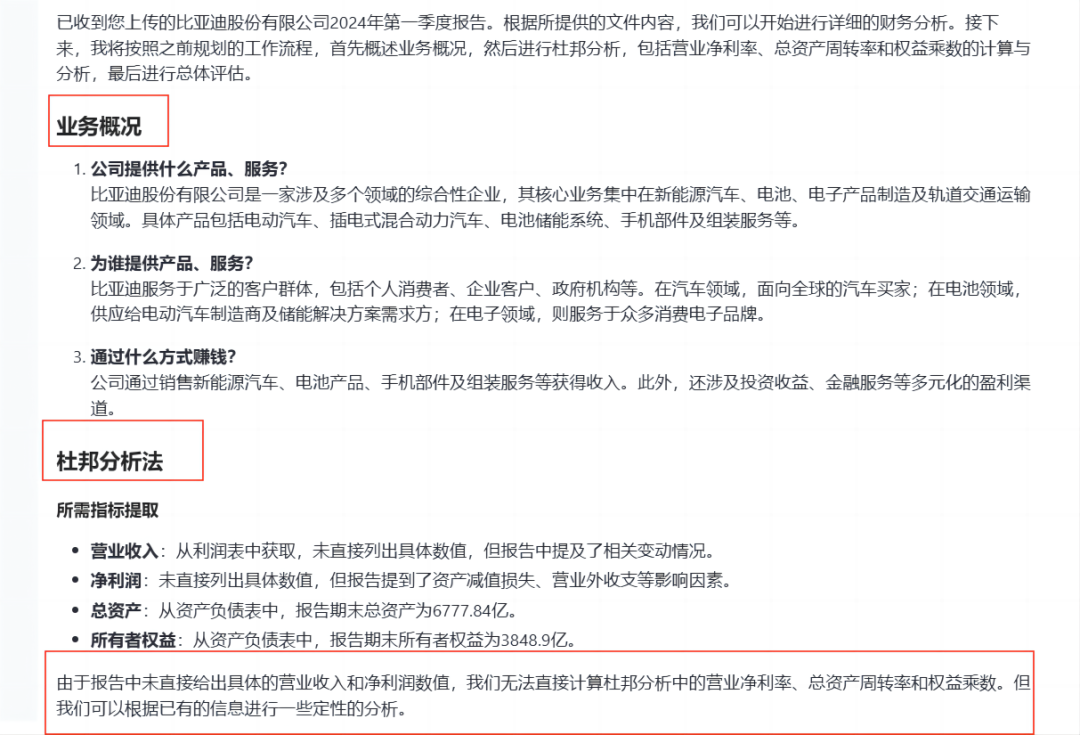 而智谱清言、通义千问等虽然也按照这一指令规定,使用杜邦分析法进行了分析,但都是“一步到位”,并未详细对这一指令中的每一个要求进行详细分解和展示。