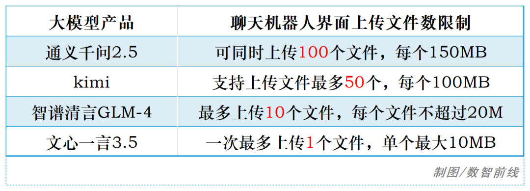大模型厂商们甚至在可上传的文件数上“卷”了起来,比如通义千问“可同时上传100个文件”,kimi最多支持上传50个文件。