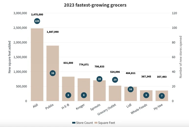 在仲量联行JLL公布的2023年全美增速最快超市排名中,ALDI蝉联第一。[1]