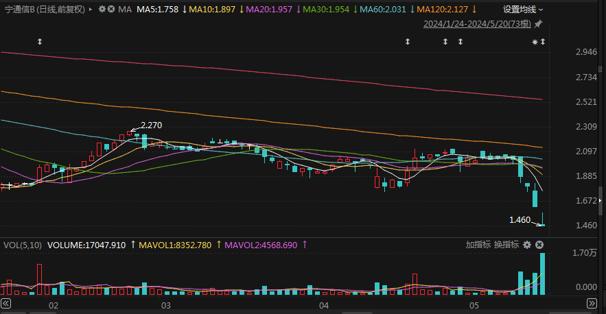 5月20日,宁通信B(200468.SZ)低开,最终收跌9.88%,触及跌停红线,报收1.46元/股,市值3.14亿元。至此,该公司已经收到两个跌停板,5月17日其最终触及10%跌停线收盘。此前5月14日至5月16日,该股票也分别收跌0.98%、7.39%、4.26%。