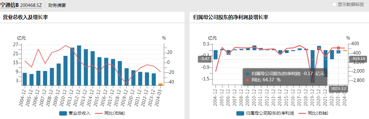 这期间,宁通信B在盈亏线附近起伏徘徊,其中,公司2014年至2016年分别亏损2053.31万元、1533.12万元、506.38万元,2017年、2018年两年盈利转正后,2019年再次亏1.69亿元,2020年再次盈利2196.46万元后,2021年、2022年、2023年宁通信B再次分别亏损1.39亿元、4739.05万元、1688.41万元。2024年一季度,该公司营收仍同比下滑18.21%至1.46亿元,继续亏损547.3万元。