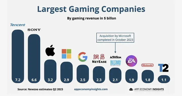 其中,腾讯更是力压索尼、动视暴雪、艺电、任天堂等巨头,排名全球第一。