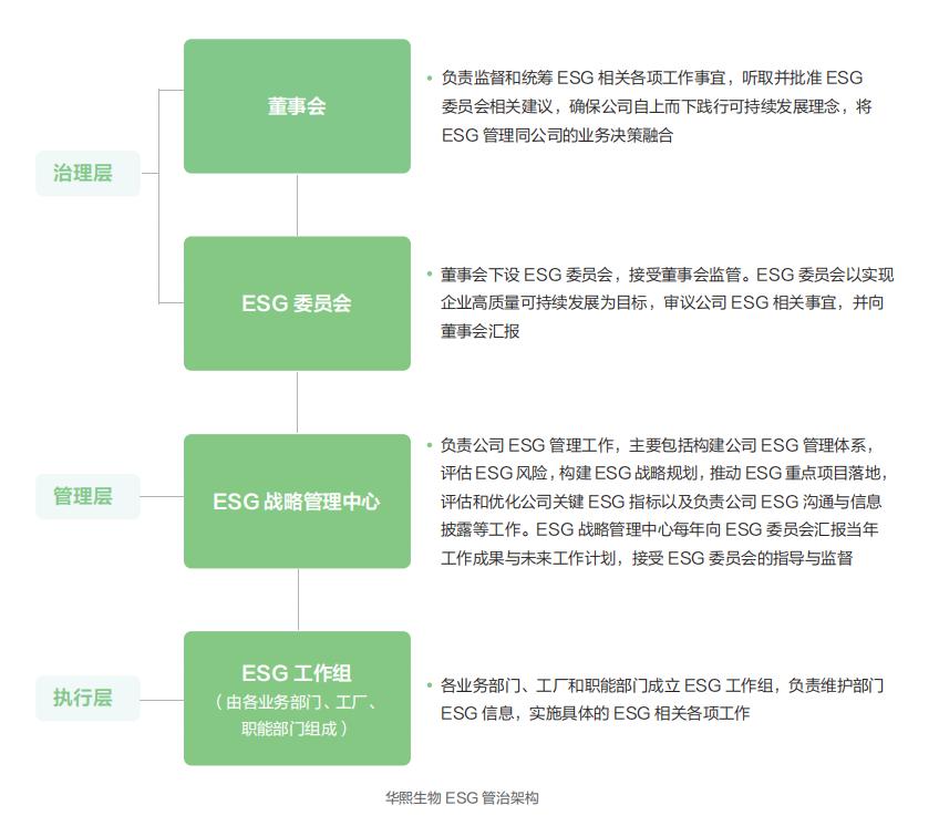 华熙生物建立了完善的三级ESG管理体系架构。最高层为董事会,负责审批ESG战略方针、重大事项决策,并监督公司ESG工作的全面执行。其下设立了ESG委员会,作为公司ESG管理的常设机构,由高层领导和相关职能部门主管组成,职责包括研究制定ESG发展战略及管理政策、审核年度ESG报告、组织实施重大决策部署、监控ESG绩效等。