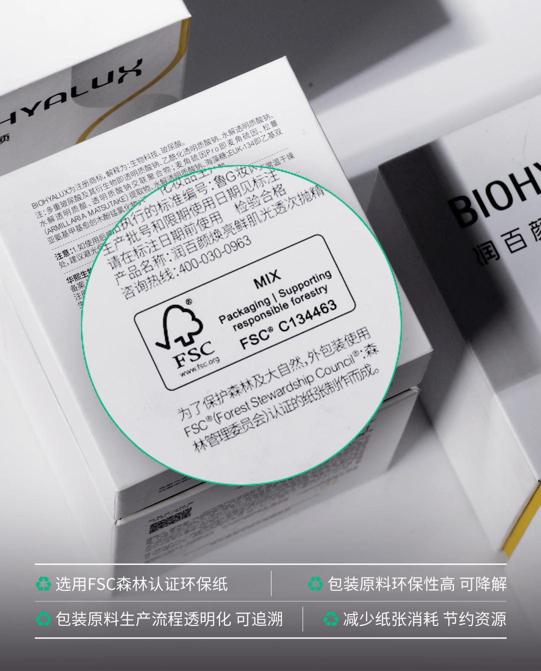 在产品包装上,华熙生物取得了FSC-COC(森林产销监管链)认证,95%以上的功能性护肤品包装均选用了FSC-COC认证环保纸,让生物降解塑料、可循环再生塑料等环保材料替代传统塑料包装。