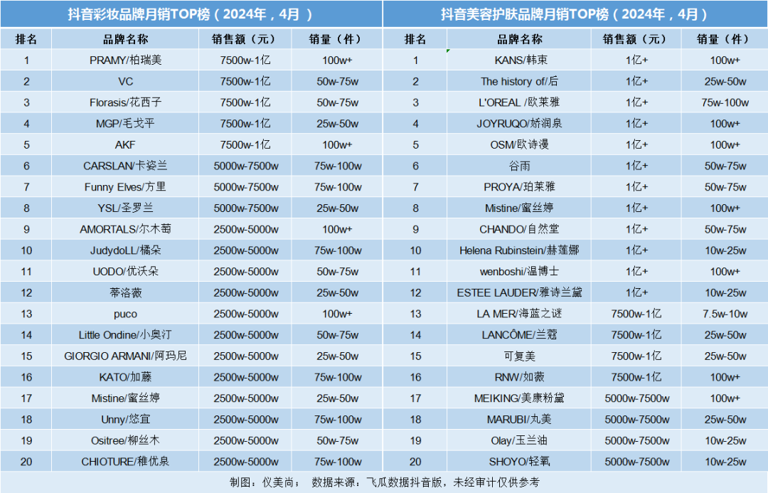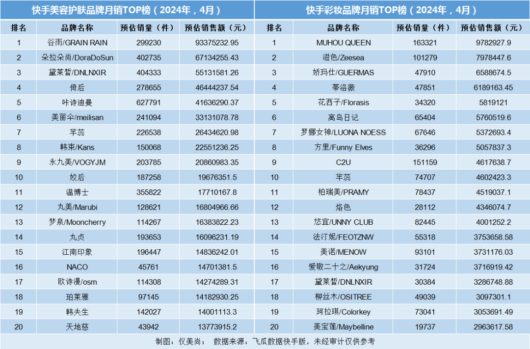 据飞瓜数据快手版,4月快手预估销售额过5000W元的品牌有5个,较3月下滑28%;预估销售额TOP500的品牌,4月美容护肤类目和彩妆类目总GMV分别为14.89亿和2.69亿,分别较3月下滑了37%和28%。