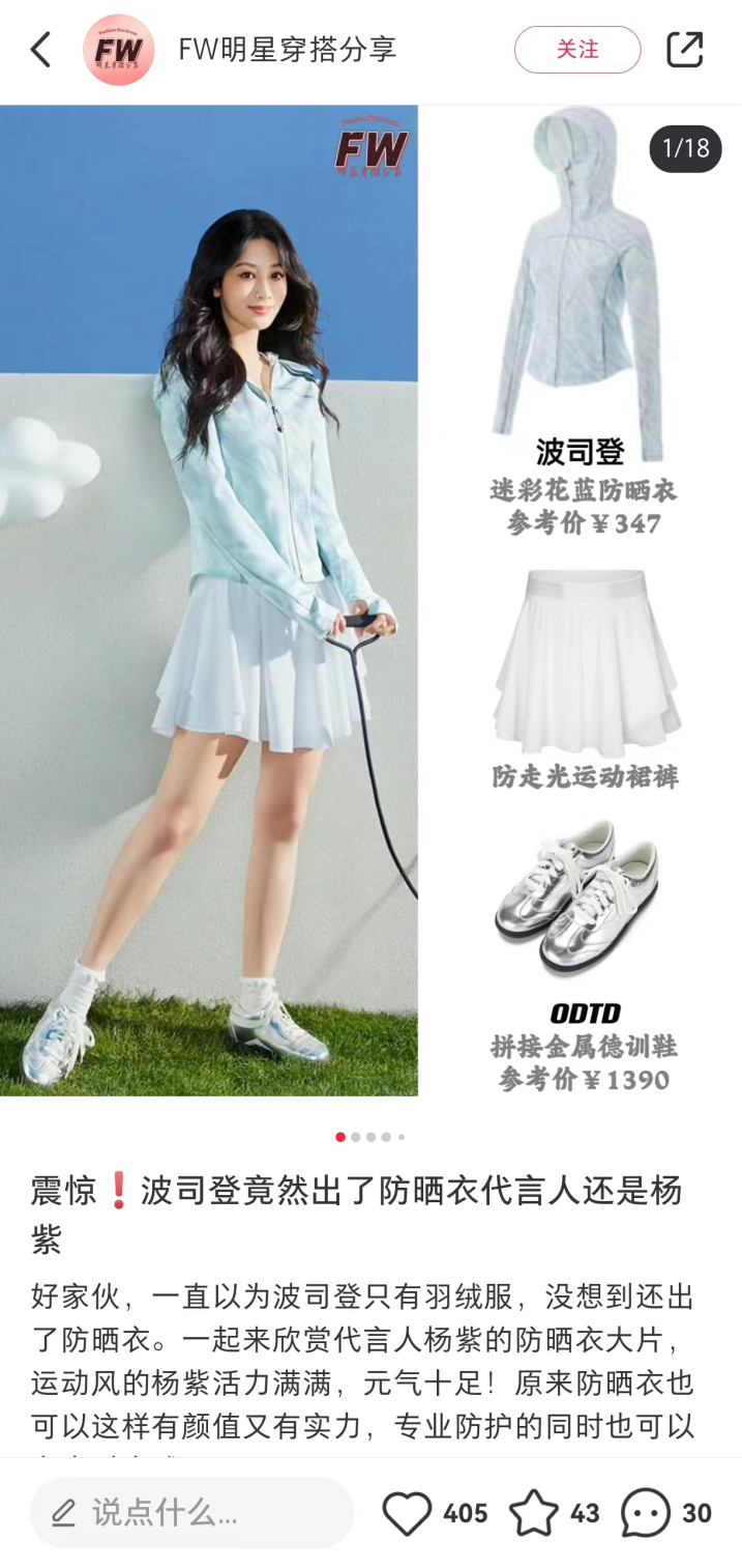 当大多数防晒服都聚焦于单一的产品时,波司登开始关注时尚穿搭,给消费者们一个夏日穿搭解决方案。在小红书上,还有KOL分享明星夏日穿波司登的搭配,实现为电商平台的引流。