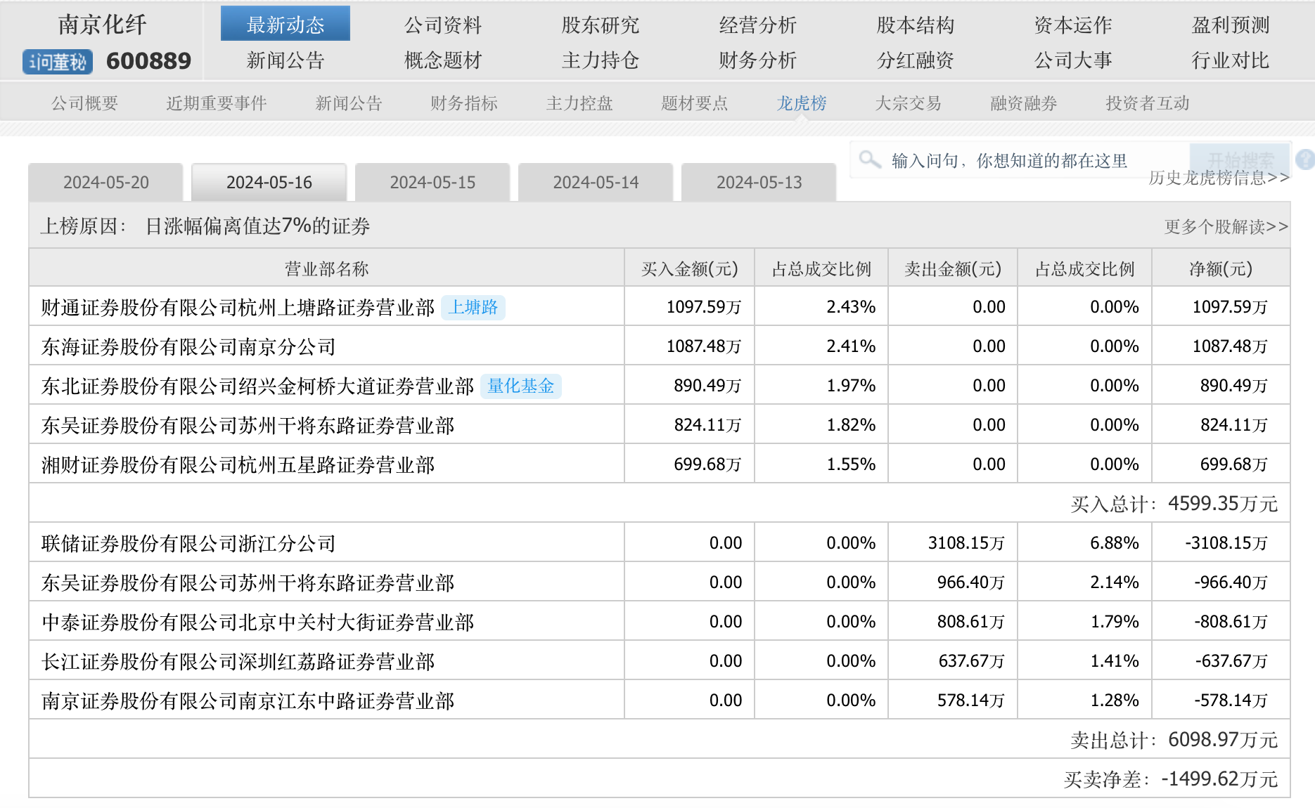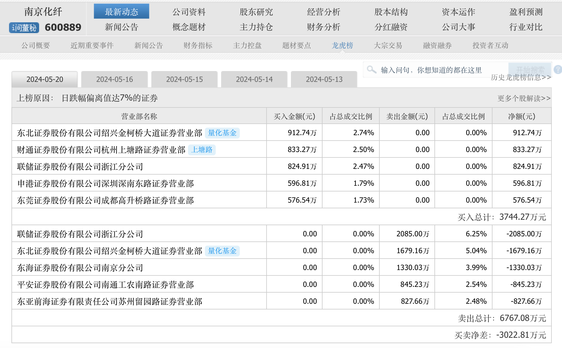 另外,财通证券杭州上塘路营业部或有资金则在5月20日被“闷在场内”,其以833.27万元的买入金额排在买入前五当中。上塘路这家席位一度在5月16日以1097.59万元的买入金额位列买1,在5月13日-15日里倒手,买入592.9万元,卖出686.15万元,也算南京化纤的“资深玩家”了。