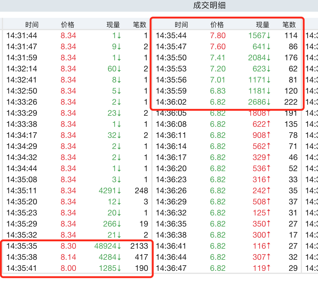 变盘出现在5月20日下午2点35分35秒。彼时,突然有2133笔卖单合计4.89万手天量出货,一口气吃掉了顶在涨停板上的筹码,平均每笔约23手,总额超4000万元。砸开后,8.14元、8元,7.8元、7.6元、7.41元等价位,也分别出现成百上千手的卖单,打得市场措手不及。最终随着下午2点36分02秒2686手卖单(222笔)的出现,将南京化纤的股价摁到了6.82元的跌停位。此时距离收盘已不足半小时。