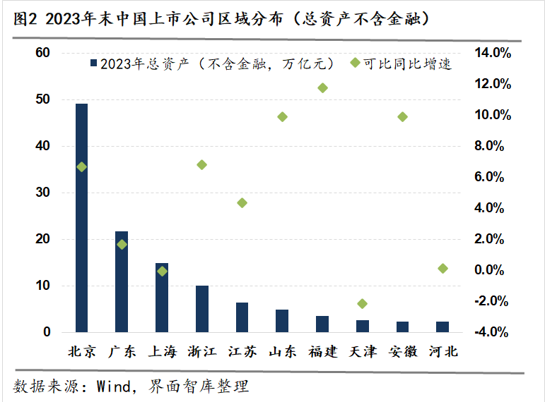 一、上市公司总资产:北京、浙江、福建、山东、安徽等地增速超过10%