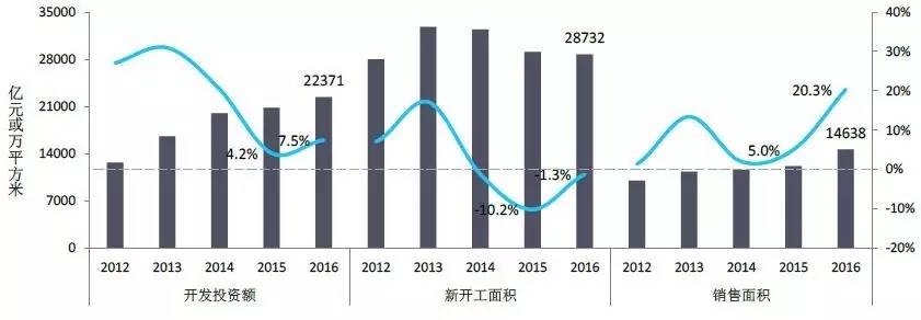 图:2012-2016年全国商业地产投资额、新开工面积、销售面积及其同比增速