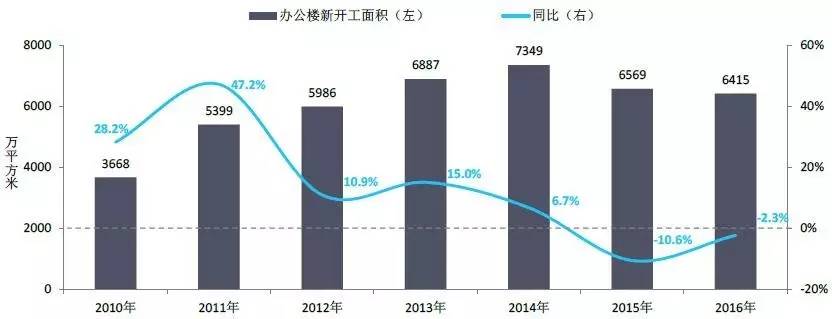 图:2010-2016年全国办公楼新开工面积及其同比增速