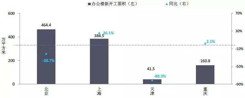 图:2016年代表城市办公楼新开工面积及其同比增速
