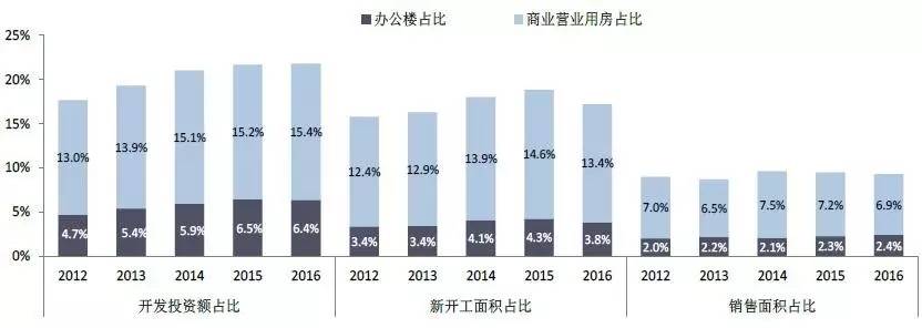 图:2012-2016年全国商业营业用房及办公楼投资、新开工面积、销售面积占比