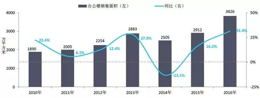 图:2010-2016年全国办公楼销售面积及其同比增速