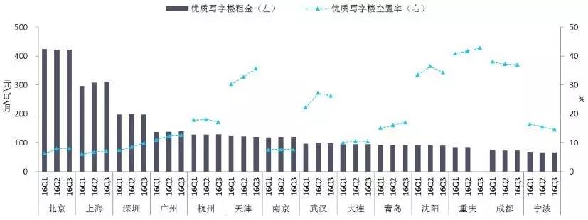 图:2016年前三季度代表城市优质写字楼租金及空置率