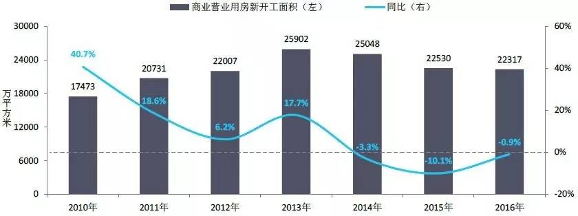 图:2010-2016年全国商业营业用房新开工面积及其同比增速