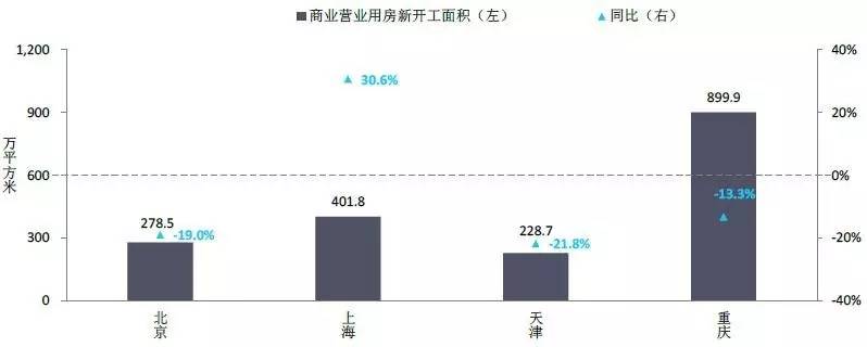 图:2016年代表城市商业营业用房新开工面积及其同比增速