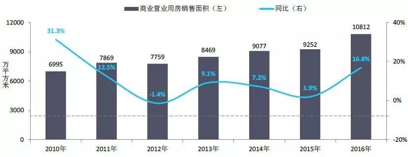 图:2010-2016年全国商业营业用房销售面积及其同比增速