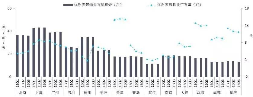 2016年,多数城市优质零售物业首层租金变化平稳,天津租金自2015年三季度起逐季下跌。从各代表城市优质零售物业首层租金情况来看,2016年,除深圳外,一线城市租金水平均维持高位,上海各季度租金均高于其他城市,第二、三季度租金达43.2元/平米/天,二线代表城市中杭州租金水平最高,已赶超深圳,各季度租金均超35元/平米/天;武汉租金在代表城市中最低,2016年第三季度租金为11.2元/平米/天。