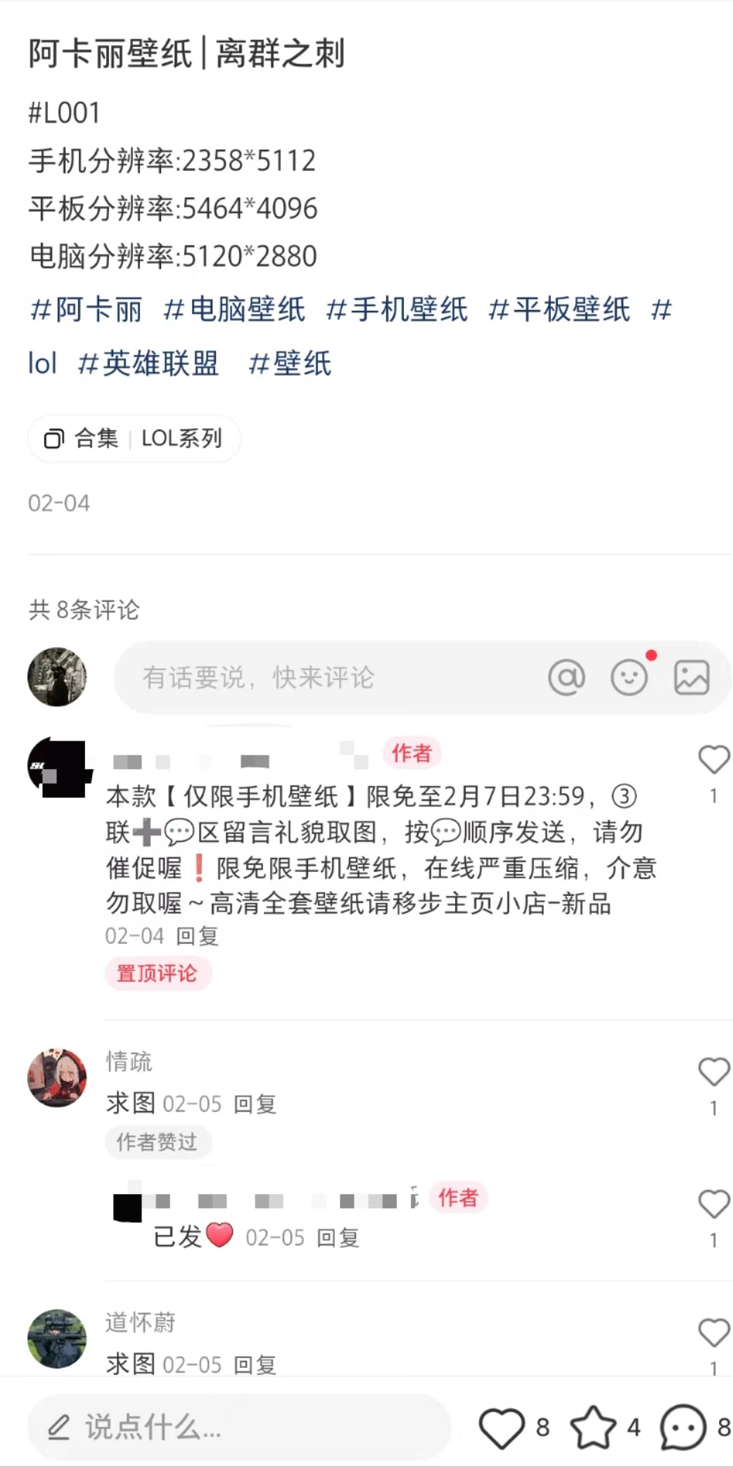 陆玖商业评论购买的手机壁纸为例,其具体变现方式如下:首先在笔记封面展示壁纸样张,如果想要原图,首先需要点赞收藏,还需要在评论区“求图”,形式如下所示