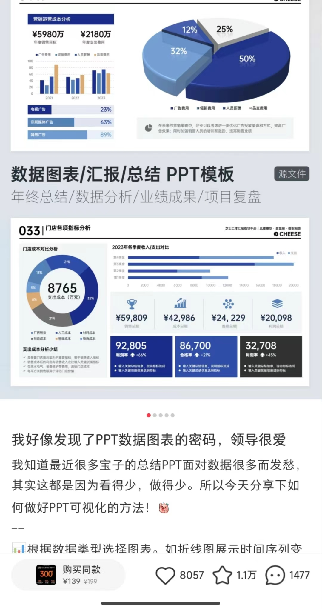 在办公学习场景,比较常见的是PPT模板,以下图笔记为例,一个单价139元的年终汇报PPT模板,在不到半年的时间里,卖出了近8000份。当然,这是在模板原创的前提下,才能卖出的单价。如果在非原创的情况下,价格通常是10元左右。