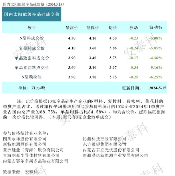 硅业分会5月15日价格数据显示,除N型料成交均价为4.3万元/吨外,其余都已跌入3万元价格区间——复投料、单晶致密料、N型颗粒硅成交均价分别为3.86万元/吨、3.73万元/吨、3.75/吨,单晶菜花料更是跌至3.37万元/吨。