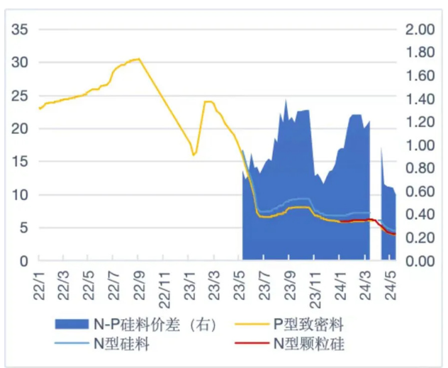 今年一季度硅料环节满产运行,使得去年四季度落地的一些硅料产能释放,带动了产量增加。与此同时,下游需求却在萎缩。这一方面与p型转n型的速度加快所带来的结构性矛盾有关;另一方面,也是受到下游市场降价、减产的影响。