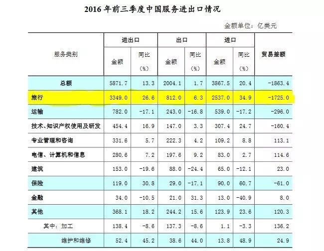 但商务部2015年5月5日发布的《中国对外贸易形势报告(2015年春季)》指出, 2014年,中国服务贸易逆差1599.3亿美元,同比增长35%。其中旅游贸易逆差为1078.9亿美元,大幅增长40.3%,占服务贸易逆差总额的67.5%,是服务贸易逆差的最大来源。2016年前三季度旅游贸易逆差就已达1725亿美元,而根据国家外汇储备管理局公布的数据,中国2016年旅行贸易逆差达2231亿美元。