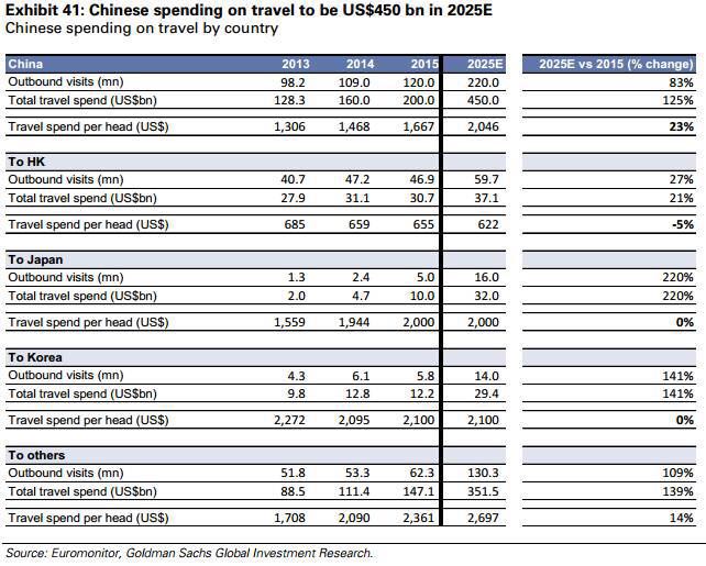 2016年,中国出境旅游虽有放缓迹象,但全年出境游人数依然高达1.22 亿人次,比2015年的1.17亿人次增长4.3%。旅游花费高达1098亿美元(约7600亿元人民币),人均花费900美元。虽然出境游人数只占旅游总人数的3%,但出境游消费却占到全国旅游花费的16%。根据高盛统计预测,到2025年,中国内地公民出境旅游将达2.25亿人次,消费支出达到4500亿美元,从2014到2015年,中国旅游贸易逆差复合增长率约达到36.05%,若按这个复合增长率计算,到2025年的旅游贸易逆差将十分惊人。