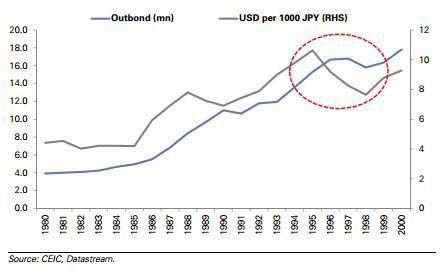 日本出境游游客数量与日元兑美元汇率之间的关系