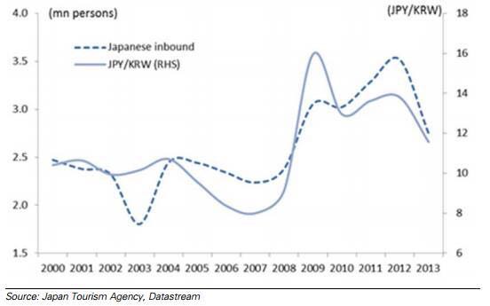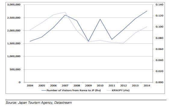 韩元/日元汇率与日本去韩国游客数量关系图