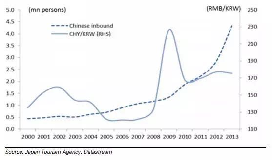 这也很好的解释了从2000年-2013年,人民币对韩元汇率波动很大,但中国赴韩国出境游却一直处于稳步增长的现象,从2010年开始,更是急剧增长。