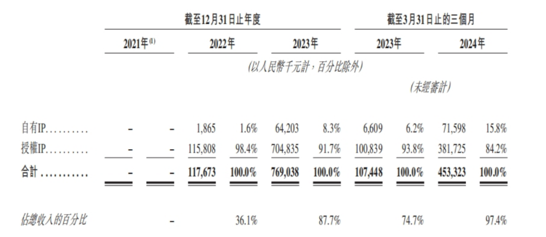 具体来看,布鲁可的“拼搭角色类玩具”围绕“自有IP”以及“授权IP”两类IP进行开发。其中“授权IP”始终占据收入大头,在2022年、2023年、2024年Q1贡献了1.16亿元、7.05亿元、3.82亿元。