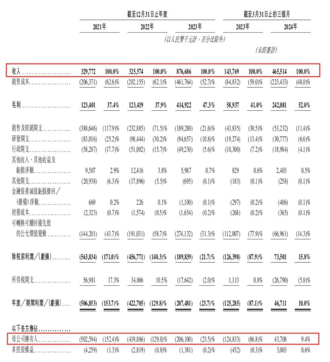 2021年、2022年、2023年及2024年Q1,布鲁可分别收入约3.30亿元、3.26亿元、8.77亿元、4.66亿元,2021年至2023年的年均复合增长率为63.0%,2024年Q1收入同比增长223.8%。